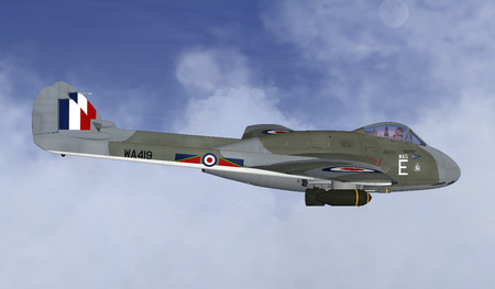 his is a repaint of the excellent freeware de Havilland Vampire FB5 by Robert Robinson, to represent WA419, flown by Wing Commander W. A. Smith, station commander of RAF Ouston around 1956. It bears the colours of No. 607 Sqdn. Royal Auxillary Air Force on the left side and No. 608 Sqdn RAuxAF on the right. Both squadrons were disbanded in 1957 along with the all other flying units of the RAuxAF.