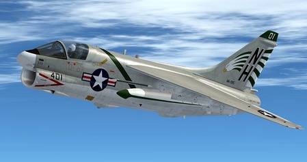 Repaint of FSX Razbam LTV A-7E Corsair II (BuNo 156889) of USN Attack Squadron VA-195 Dambusters (Hi-Viz), as it appeared in 1970 at the annual Farnborough International Airshow, prior to deploying aboard USS Kitty Hawk, CVA-63, for the squadron's 6th Vietnam tour and their first in the A-7.