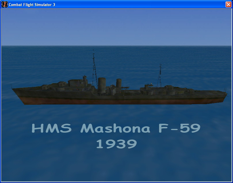 This is a repaint of the stock British Tribal Class Destroyer painted as HMS Mashona in a 1939 Home Fleet scheme of overall 507A Dark Blue. This file is the same as the one on my website (www.fouteman-goes-cfs3.tk) and was created in 2009.