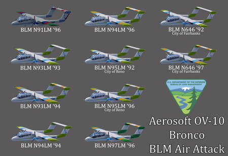 Inspired by Scorchs OV-10 pack in which he had a BLM bronco in. I decided to do the entire BLM fleet from the 1990s. Total of 6 aircraft and 10 repaints. You will need the Aerosoft Bronco X payware for these to work. Compatible in P3D and FSX.