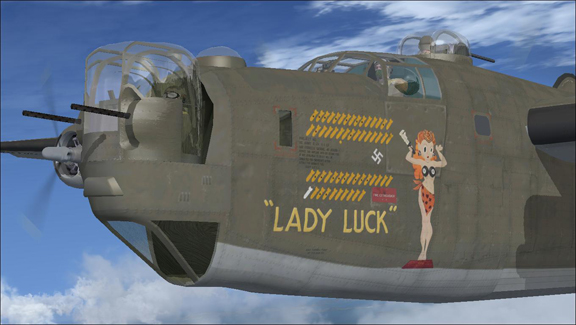 This is a repaint of the outstanding payware Alpha Sim B-24 representing “Lady Luck” B-24 of the 8th AF, 446th Bomb Group known as the “Bungay Buckeroos”.
