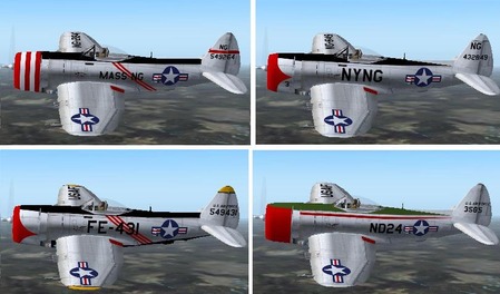 Skins for A.F. Scrub's P-47D Thunderbolt depicting F-47Ds in the colors and markings of three U.S. Air Force and four National Guard and Air National Guard units as they appeared in the late 1940s and early 1950s. Includes planes from the Massachusetts, New York, Rhode Island and Virginia Guard, the USAF's 47th Fighter Interceptor Squadron, USAFE's 86th Fighter Group, and one unidentified active Air Force unit.